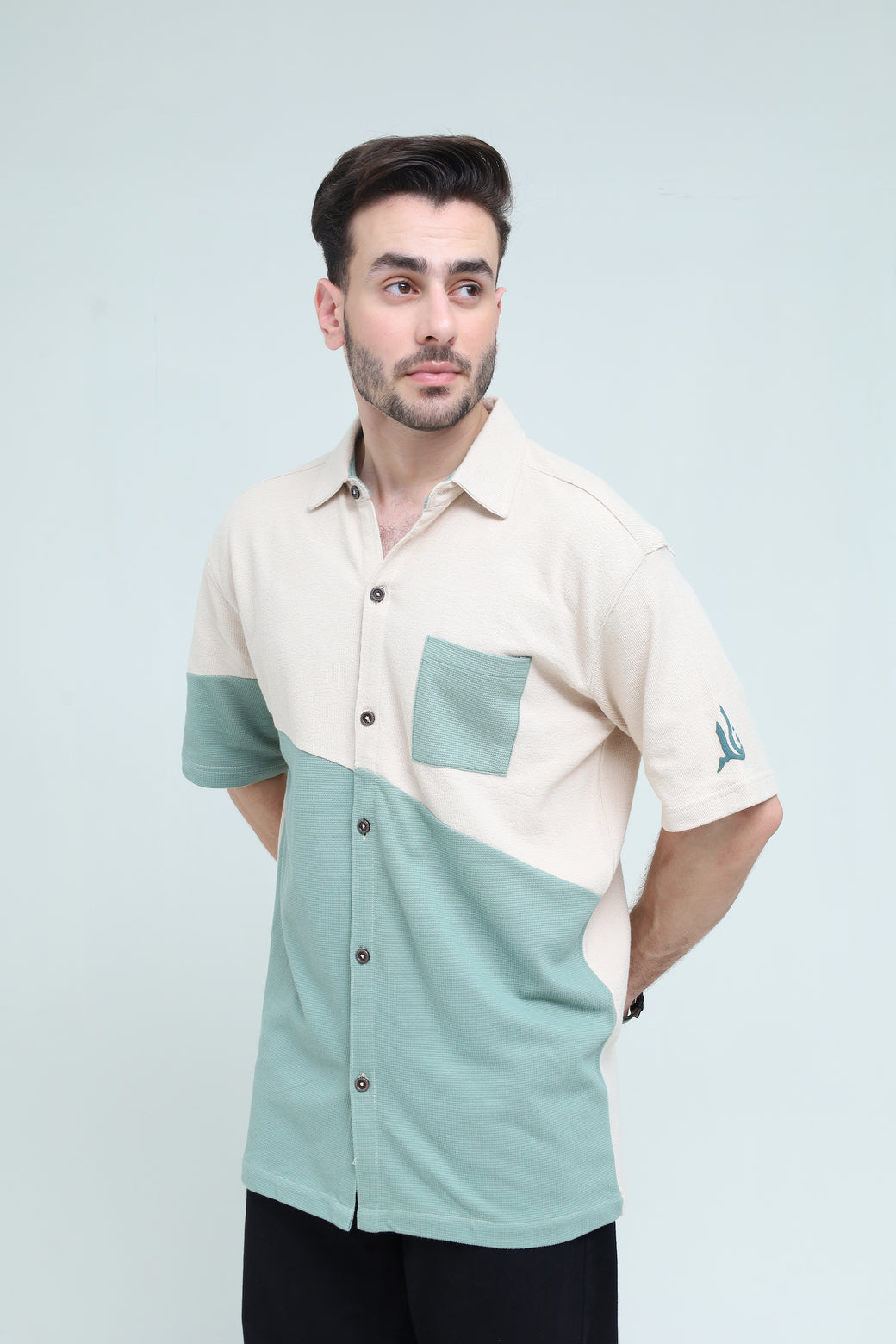 Make a bold statement with our new tri-color cut and sew button-down shirt. This half-sleeve...