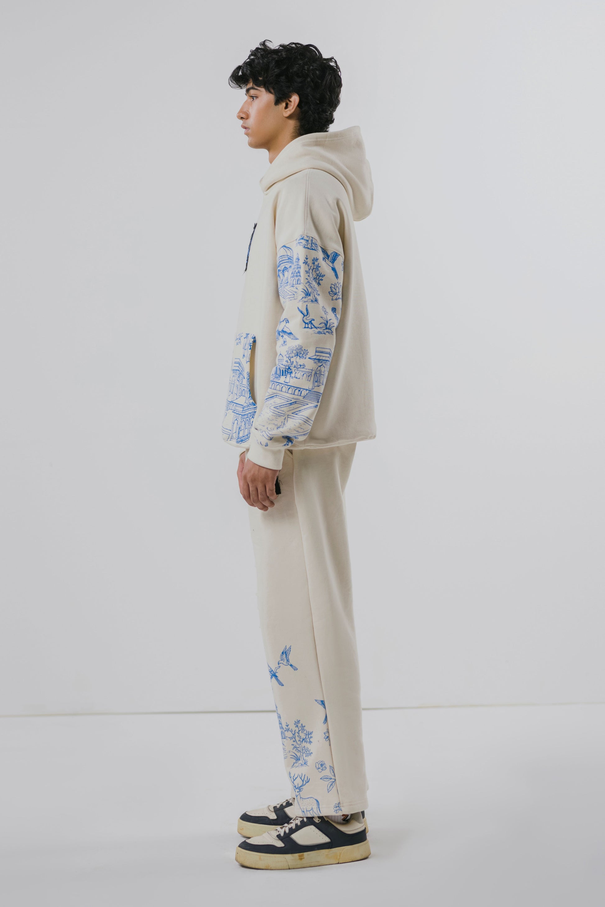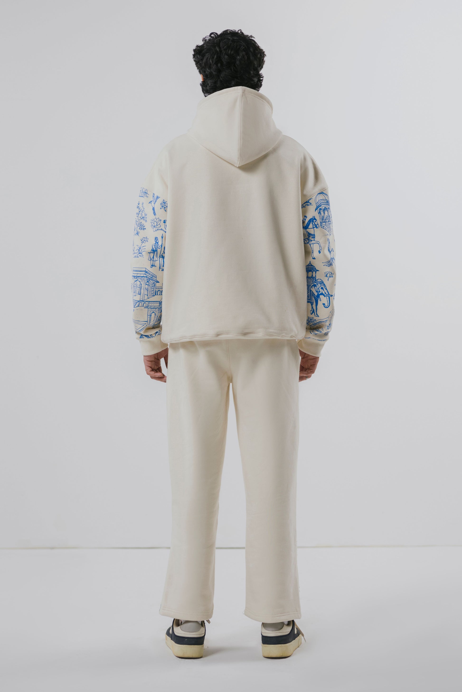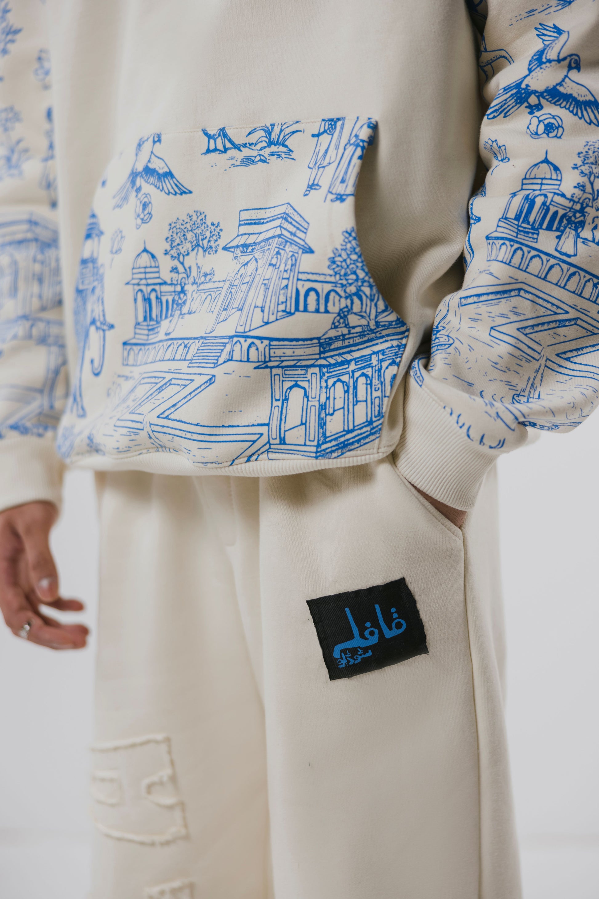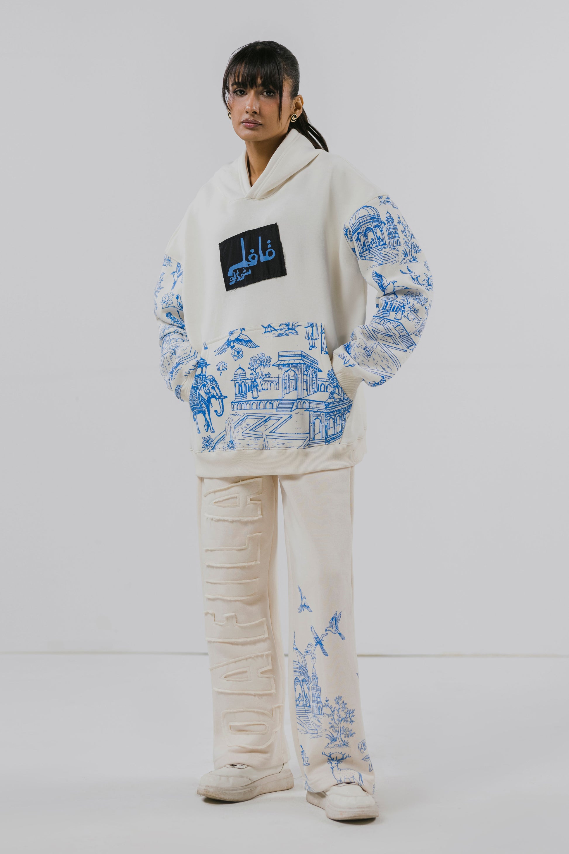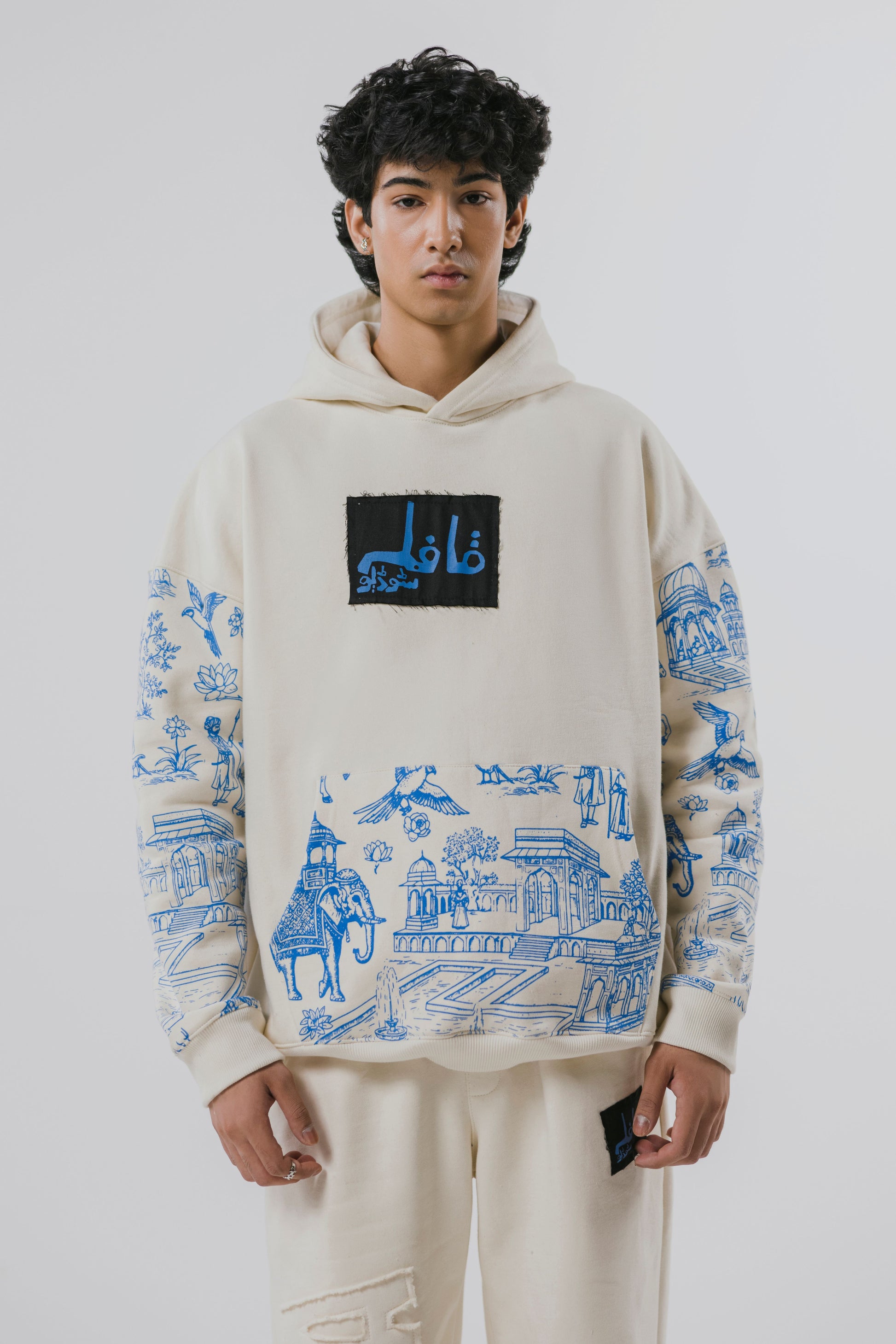 This oversized hoodie by QAFILA STUDIO for the Fall/Winter '25 unisex collection, blending the French illustrative style of Toile de Jouy with the grandeur of the Mughal Empire. Titled 'Naqsh-e-Saltanat' (Imprint of the Empire), the design features intricate screen-printed illustrations on the sleeves, depicting a fantastical Mughal world with elephants, palace architecture, and botanical motifs. This comfortable silhouette acts as a "protective cloak," displaying a rich, imagined history with a modern QAFILA crest on the front.