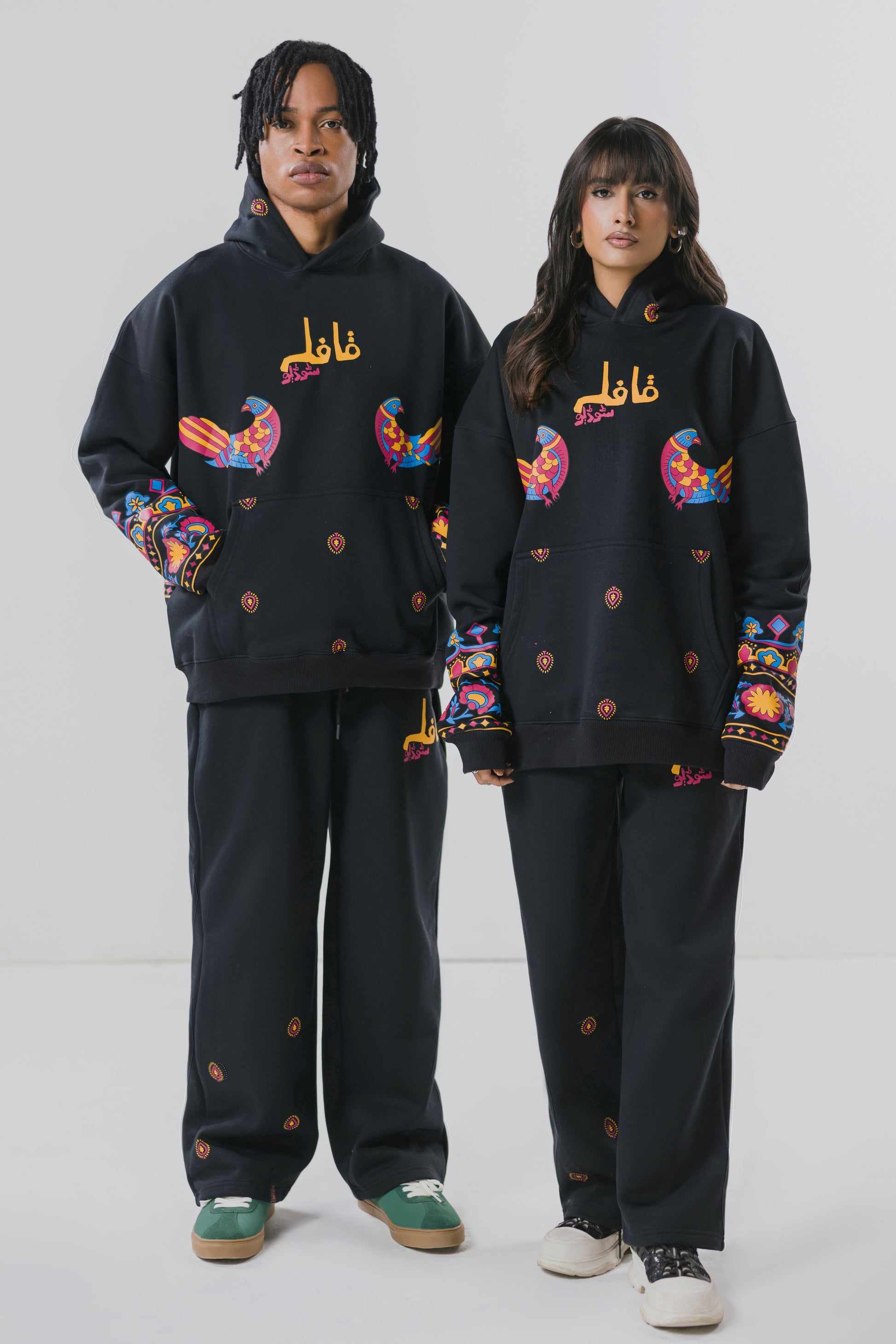 The "Parinda Baaz" oversized hoodie for the Fall/Winter 2025 "Wandering Heritage" theme is a visual narrative of cultural movement and identity. It features the QAFILA branding at the chest, guarded by two vibrant birds, symbolizing migration and shared legacy, alongside small mirror-work-like motifs. The sleeves are adorned with a digital interpretation of regional Pakistani folk embroidery (Sindhi, Balochi, Multani), representing evolving cultural roots. Finally, the back and hood showcase a full-width print replicating the intricate layering of a phulkari or rilli border, symbolizing protection and the constant presence of the past.