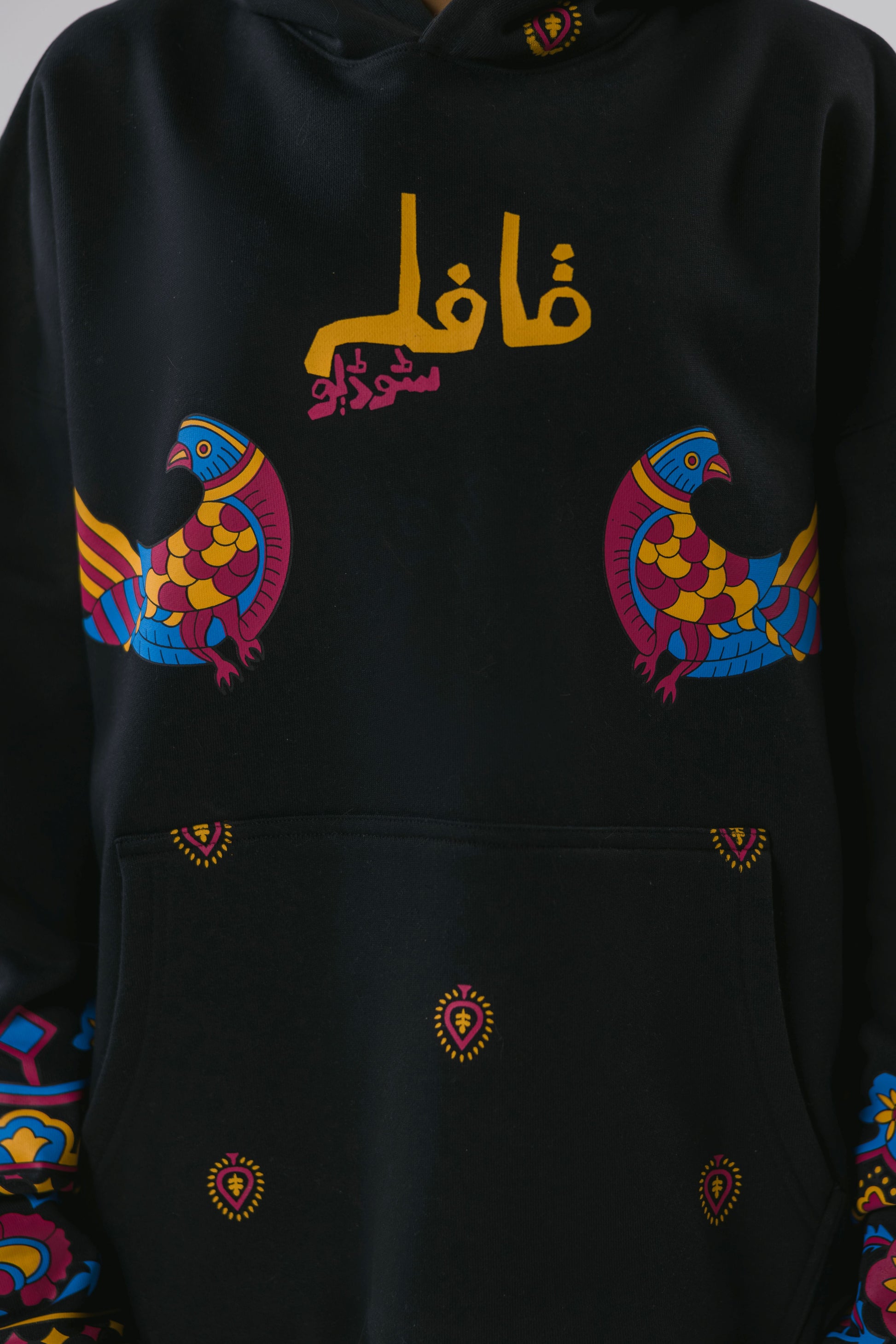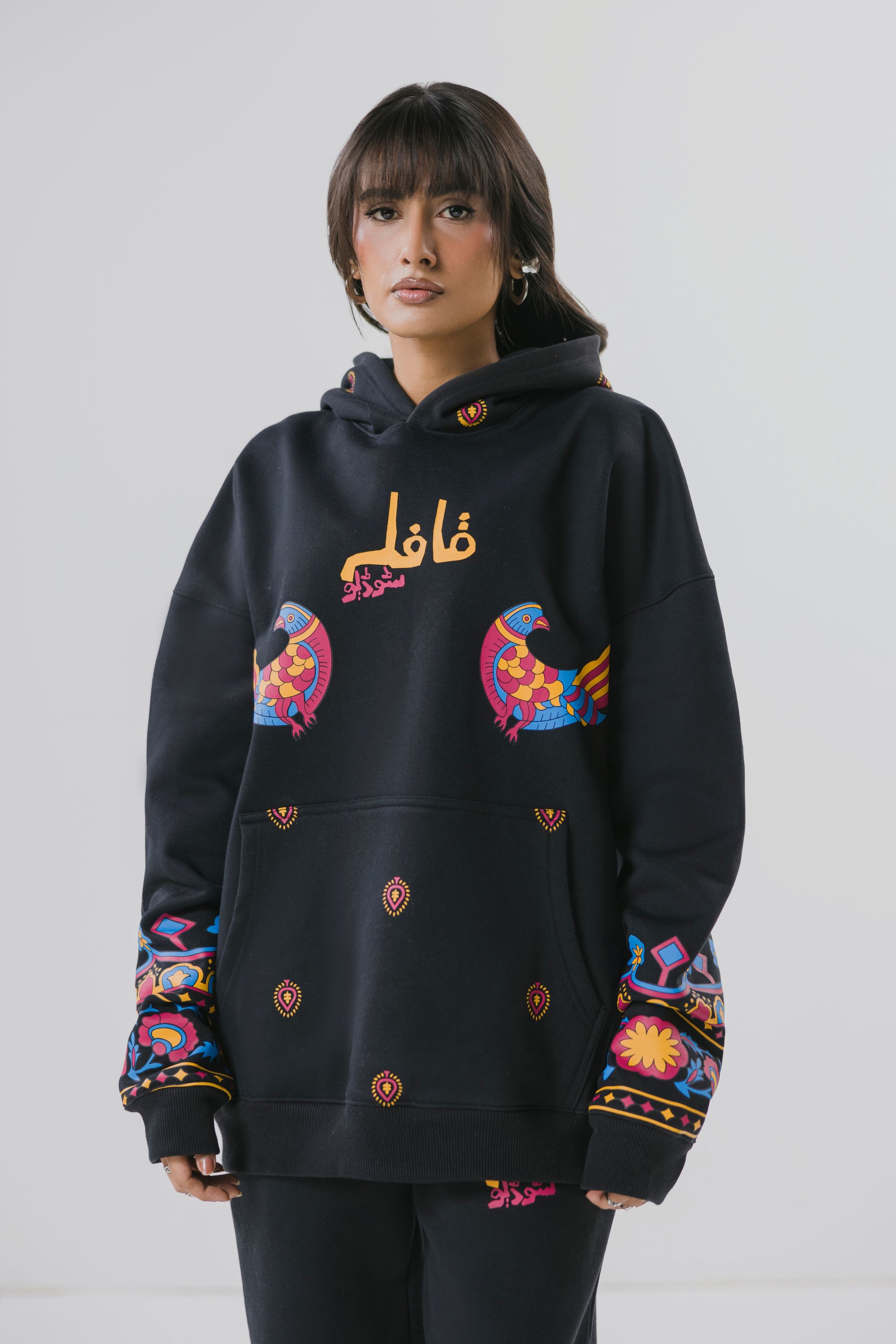 The "Parinda Baaz" co-ord set for the Fall/Winter 2025 "Wandering Heritage" theme is a visual narrative of cultural movement and identity. It features the QAFILA branding at the chest, guarded by two vibrant birds, symbolizing migration and shared legacy, alongside small mirror-work-like motifs. The sleeves are adorned with a digital interpretation of regional Pakistani folk embroidery (Sindhi, Balochi, Multani), representing evolving cultural roots. Finally, the back and hood showcase a full-width print replicating the intricate layering of a phulkari or rilli border, symbolizing protection and the constant presence of the past.
