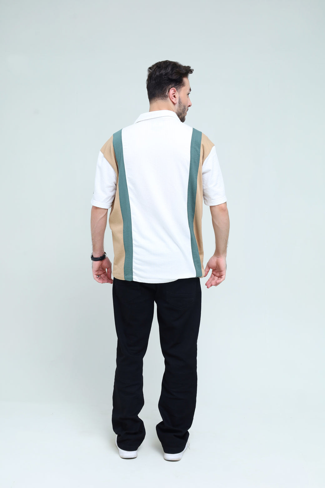 Make a bold statement with our new tri-color cut and sew button-down shirt. This half-sleeve shirt is a fresh take on casual style, designed for those who appreciate a unique and modern aesthetic.